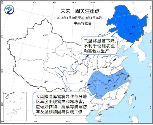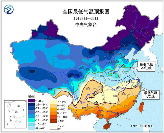 1月23日至月底,影響我國的冷空氣頻繁且勢力較強。23-26日,受強冷空氣影響,中東部大部地區自北向南先后有4~5級偏北風,陣風6~7級;黃淮及其以南地區氣溫下降6~8℃,部分降溫幅度可達10~12℃。在此期間,中東部大部地區日平均氣溫較常年同期偏低2~5℃,部分地區偏低6℃以上。最低氣溫0℃線將南壓至浙江北部、江西北部、湖南南部至貴州南部一線,-10℃線位于甘肅東南部、陜西中部到河北南部、山東中部一線。我國東部和南部海區先后有6~8級、陣風9~10級大風。