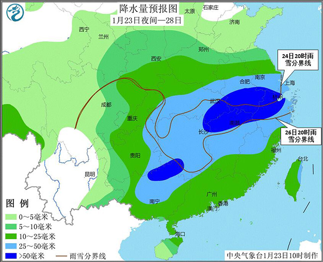 預計,直至28日,西北地區東部、黃淮西部和南部、江淮、江漢、江南北部等地先后有中到大雪或雨夾雪,其中陜西東南部、河南南部、湖北大部、安徽、江蘇南部、浙江西北部等地的部分地區有暴雪,局地大暴雪;貴州、湖南、湖北等地部分地區有凍雨。其中,降雪集中時段在1月24日-25日、27日。