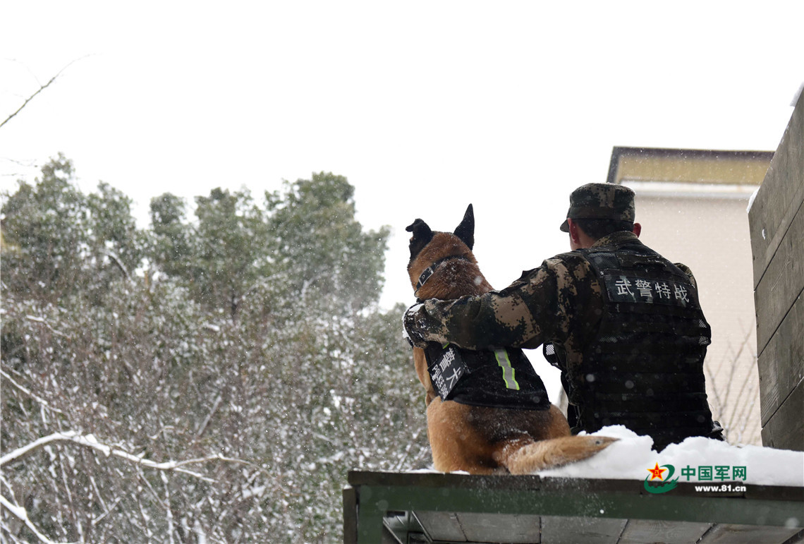 1月27日,武警安徽總隊(duì)機(jī)動(dòng)支隊(duì)警犬班班長王營廣與警犬“魯克”互動(dòng)交流,增進(jìn)情感。