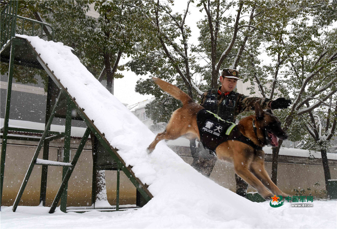 1月27日,武警安徽總隊機動支隊警犬班班長王營廣帶領警犬“魯克”通過障礙。