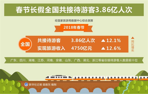 經國家旅游局數據中心綜合測算,今年春節全國共接待游客3.86億人次,同比增長12.1%,實現旅游收入4750億元,同比增長12.6%。