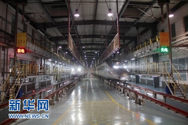 凌晨時分,石家莊動車運用所內(nèi)依舊燈火通明。新華網(wǎng) 金佳緒 攝