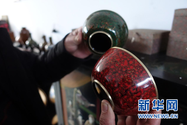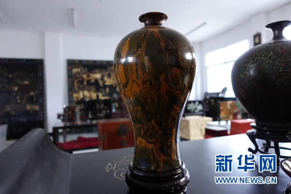 “流淌漆”技藝制作的花瓶?!傲魈势帷奔赐ㄟ^變換液態漆的濕度及流下的角度,使之形成自然的漆面花紋。新華網 卓越 攝