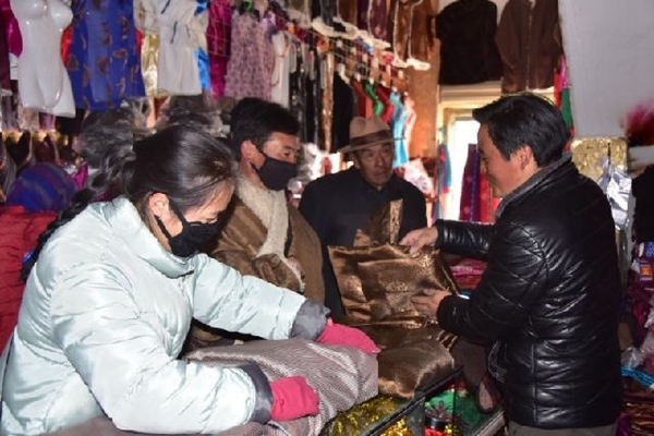 今年的藏歷新年和春節(jié)“喜相逢”。月初,同德縣城老城區(qū)車水馬龍,處處洋溢著過(guò)年的喜慶氣氛,擁擠的街道兩旁擺滿了各式各樣的商品,各族群眾忙著購(gòu)置年貨。老旦正忙著打理自己的藏服店,十幾種藏服款式,吸引著一撥撥的客人惠顧,讓他幾乎沒(méi)有空閑和記者聊天。他說(shuō),這段時(shí)間每天的毛收入都在萬(wàn)八千的?!翱腿硕嗟臅r(shí)候連午飯都顧不上吃!”