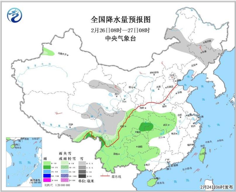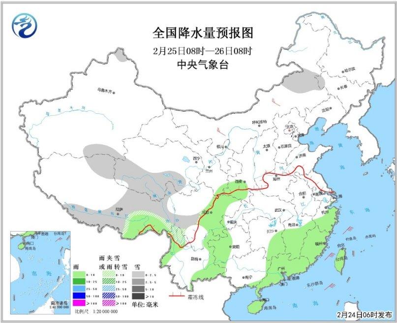 24至25日,西南地區(qū)東部、江漢、江淮、江南大部、華南等地有小到中雨。26日夜間起,南方地區(qū)將自西向東出現一次中到大雨過程。