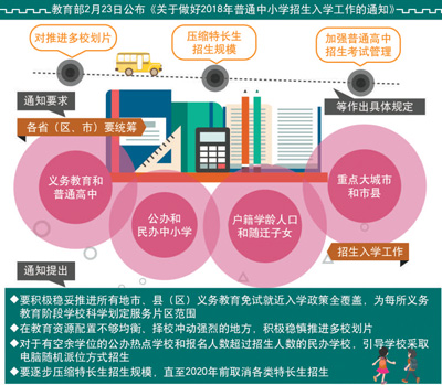 為進一步治理義務教育階段“擇校熱”,解決中小學招生入學工作中的熱點難點問題,教育部23日公布《關于做好2018年普通中小學招生入學工作的通知》,對推進多校劃片、壓縮特長生招生規模、加強普通高中招生考試管理等作出具體規定。>>