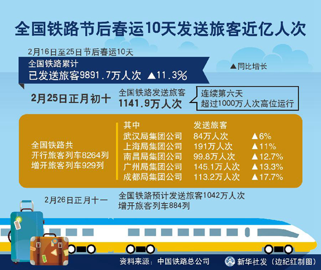 2月26日,全國鐵路發送旅客1084萬人次,客流略有回落但仍保持高位運行,已連續七天超過1000萬人次;春運同比增加145.5萬人次,增長15.5%,為今年春運以來同比增幅最大的一天。全國鐵路共開行旅客列車8155列,增開旅客列車884列。武漢局集團公司當日發送旅客78.3萬人次,同比增長8.5%;上海局集團公司發送旅客185.6萬人次,同比增長15.2%;南昌局集團公司發送旅客92.5萬人次,同比增長12.7%;廣州局集團公司發送旅客137.5萬人次,同比增長16.8%;成都局集團公司發送旅客108.6萬人次,同比增長18.8%。