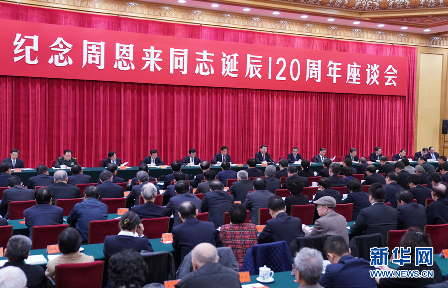 3月1日,中共中央在北京人民大會堂舉行紀念周恩來同志誕辰120周年座談會。中共中央總書記、國家主席、中央軍委主席習近平發表重要講話,中共中央政治局常委李克強、栗戰書、汪洋、王滬寧、趙樂際、韓正出席座談會。新華社記者謝環馳攝