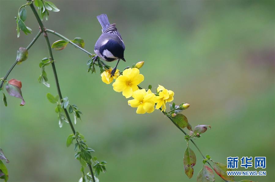 3月14日,在湖南省衡陽市生態公園,一只小鳥停留在花枝上。新華社發(曹正平 攝)