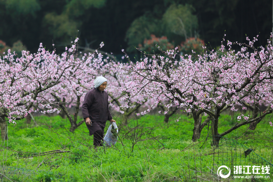 3月25日,浙江省寧波市橫溪鎮生態農業園工作人員在桃花林內勞作。