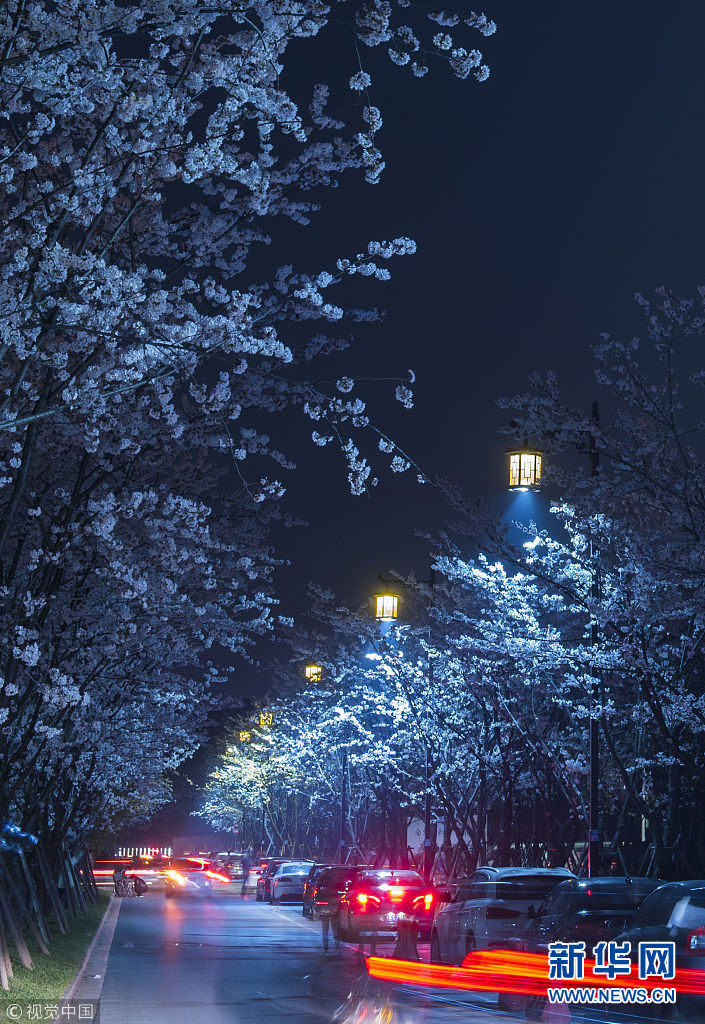 3月25日,揚州鑒真大道,夜幕下的櫻花,在燈光月色的輝映下別有一番意境。(圖片來源:視覺中國)