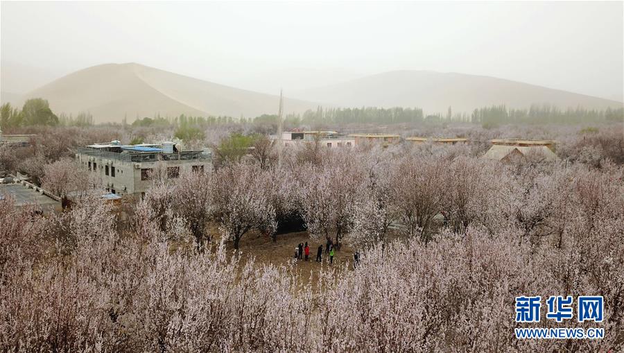 3月28日,游客在敦煌鳴沙山下的李廣杏園內賞花。近日,甘肅省敦煌市鳴沙山下8000多畝李廣杏花競相開放,吸引了眾多游客和市民踏青賞花。 新華社記者陳斌攝