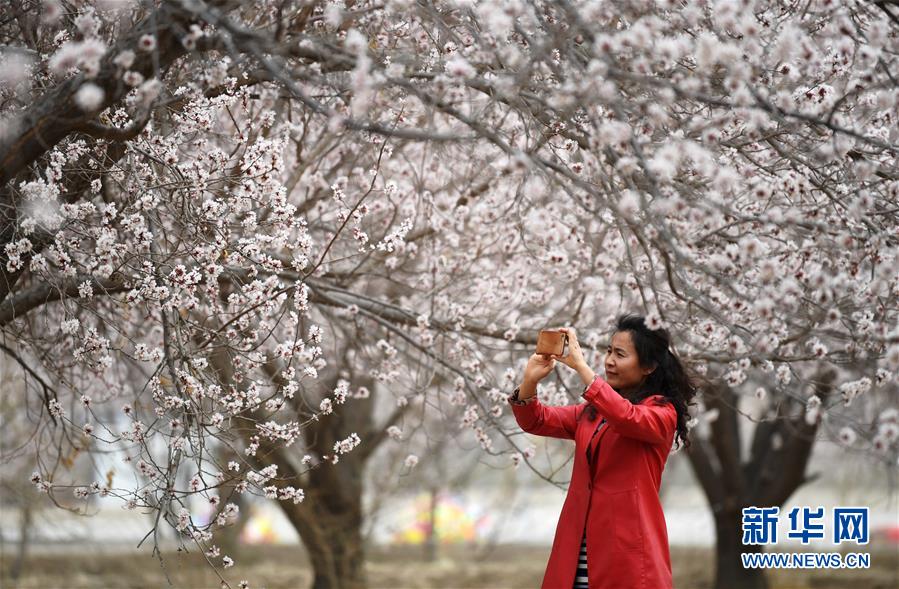 3月28日,游客在敦煌鳴沙山下的李廣杏園內賞花拍照。近日,甘肅省敦煌市鳴沙山下8000多畝李廣杏花競相開放,吸引了眾多游客和市民踏青賞花。 新華社記者陳斌攝