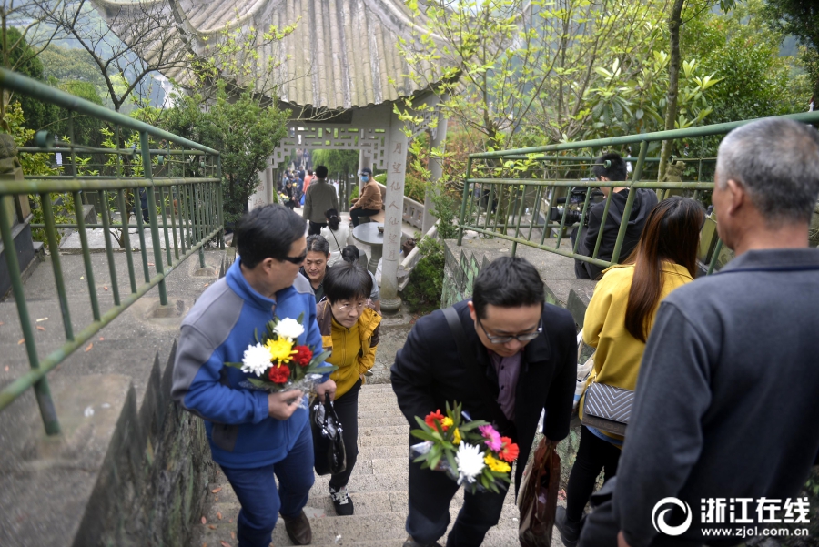 4月5日清明節上午,前往浙江省定舟山市定海區清陵掃墓人絡繹不絕,不少掃墓人用鮮花祭祀,寄托哀思懷念逝去的親人,倡導環保綠色的清明。(浙江在線拍友 胡社友 攝)