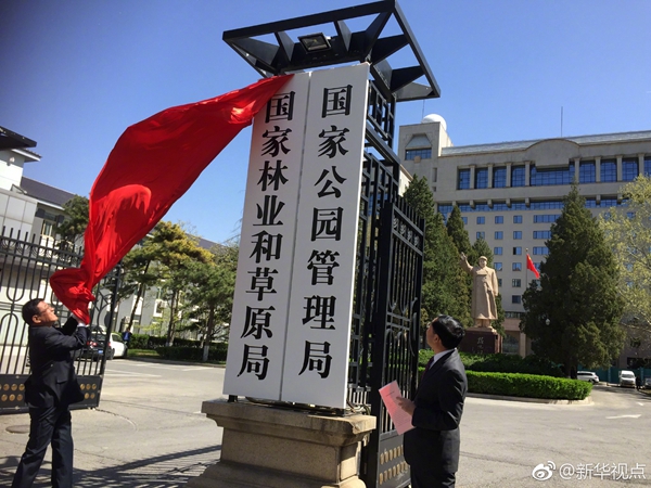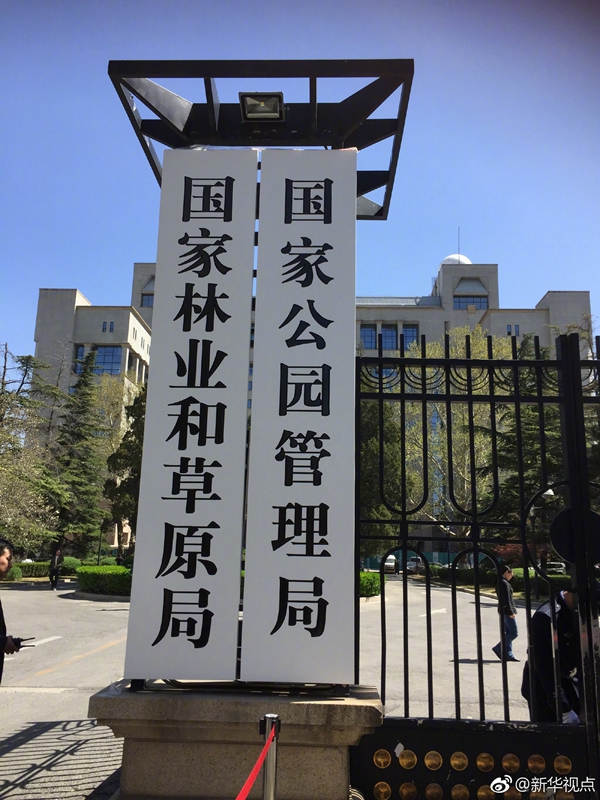 新華網北京4月10日電? 國家林業和草原局、國家公園管理局10日正式揭牌,由自然資源部管理,這對統籌山水林田湖草系統治理具有重要意義。(記者 侯雪靜 胡璐) ????(據新華社“新華視點”微博)