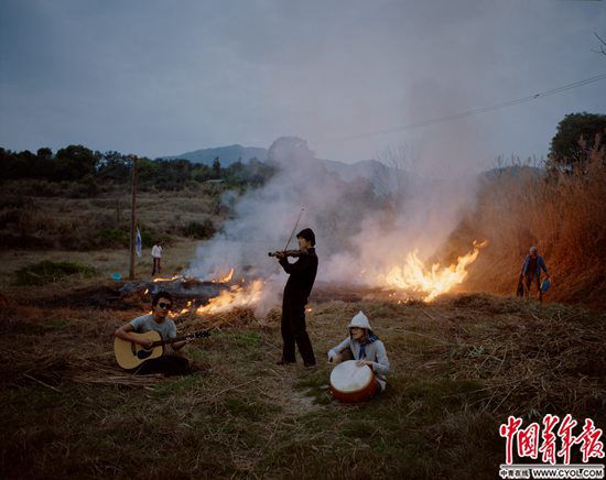 3月14日傍晚,福建省福州市閩侯縣關(guān)中村,“南部生活”共識社區(qū)成員在墾荒前將蘆葦和野草燒掉,日本建筑師吉富遙樹、社區(qū)發(fā)起人唐冠華和邢振(左至右)見到燒荒的場景,臨時(shí)起意來到現(xiàn)場演奏。