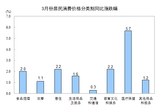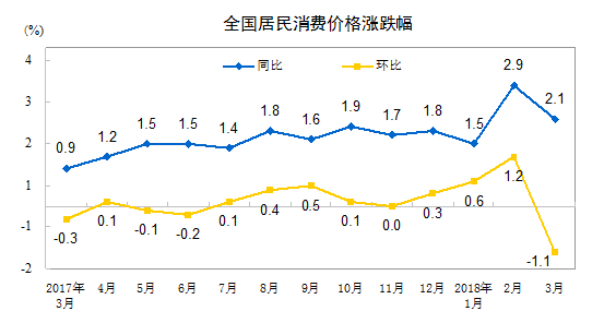 2018年3月份,全國居民消費(fèi)價格同比上漲2.1%。其中,城市上漲2.1%,農(nóng)村上漲1.9%;食品價格上漲2.1%,非食品價格上漲2.1%;消費(fèi)品價格上漲1.6%,服務(wù)價格上漲2.8%。一季度,全國居民消費(fèi)價格總水平比去年同期上漲2.1%。