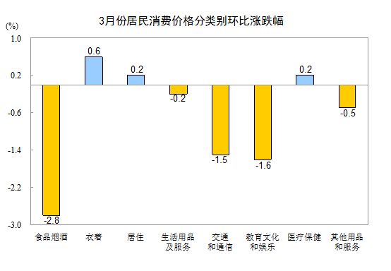 3月份,全國居民消費(fèi)價格環(huán)比下降1.1%。其中,城市下降1.1%,農(nóng)村下降1.2%;食品價格下降4.2%,非食品價格下降0.4%;消費(fèi)品價格下降1.4%,服務(wù)價格下降0.7%。