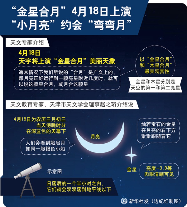 天文教育專家、天津市天文學會理事趙之珩介紹說,18日為農歷三月初三,當天傍晚時分,在深藍色的天幕下,人們會看到娥眉月如同一艘銀色小船,燦若寶石的金星在月亮的右下方緊緊跟隨著它。星月交輝,形影相隨,為暮春的天宇增添精彩。