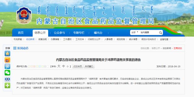 內蒙古自治區食品藥品監督管理局關于鴻茅藥酒有關事宜的通告