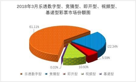1月至3月累計,樂透數字型彩票銷售640.31億元,同比增加33.21億元,增長5.5%;競猜型彩票銷售227.05億元,同比增加60.29億元,增長36.2%;即開型彩票銷售59.45億元,同比減少4.49億元,下降7.0%;視頻型彩票銷售114.62億元,同比增加0.40億元,增長0.3%;基諾型彩票銷售0.32億元,同比減少0.13億元,下降28.4%。1月至3月份樂透數字型、競猜型、即開型、視頻型和基諾型彩票銷售量分別占彩票銷售總量的61.46%、21.80%、5.71%、11.00%、0.03%。