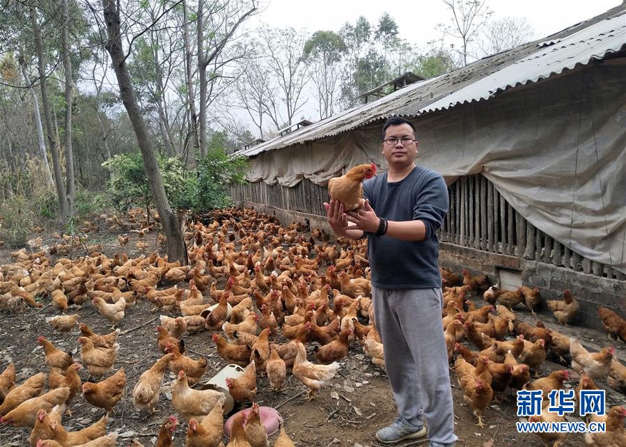 在江西省定南縣雞卿寨生態蛋雞合作社,“一村一名大學生”工程學員李良華在基地展示放養的生態蛋雞(3月17日攝)。新華社發