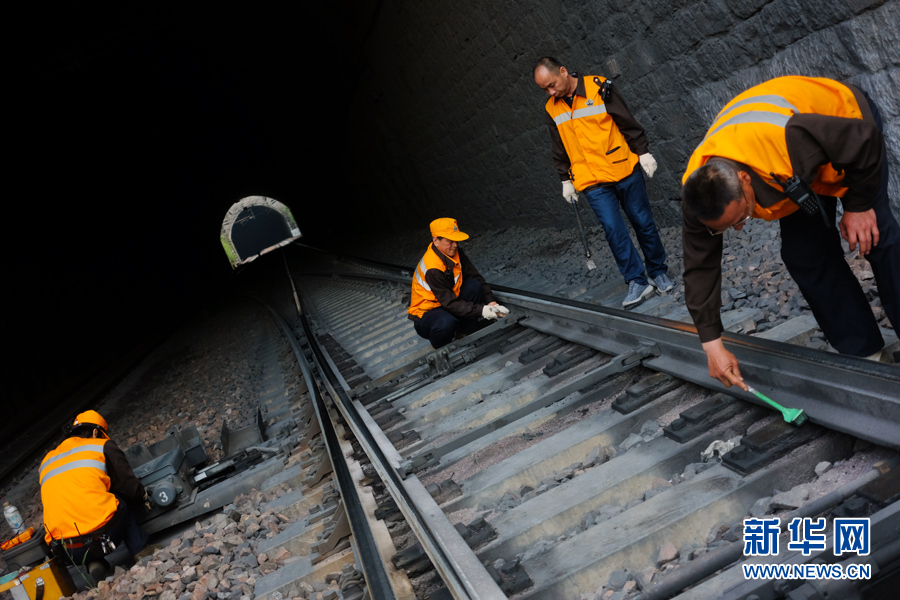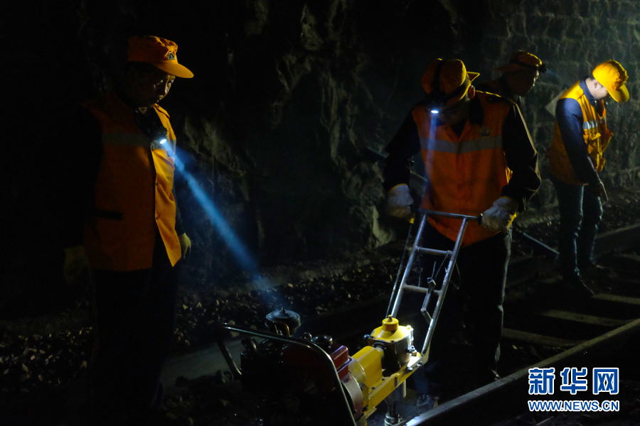 鐵路職工在隧道作業(yè)。他們的工作被稱為“改道”,要把兩條鐵軌距離與標準數據的誤差控制在-2mm到+6mm之間。新華網陳俊松 攝