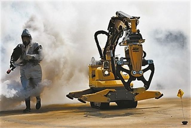 他是在真毒真防演練中,利用機器人等高科技裝備對突發事故進行應急處置的火箭軍防化兵