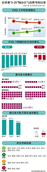 評(píng)估結(jié)果顯示,2017年10月至2018年3月,“2+26”城市PM2.5平均濃度最低的3個(gè)城市依次是北京、廊坊和天津;濃度最高的3個(gè)城市依次是邯鄲、邢臺(tái)和安陽。