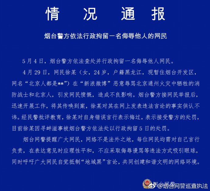 山東省煙臺市公安局網絡安全保衛支隊官方微博今日發布情況通報。通報稱,一女子在微博惡意辱罵北京通州火災中犧牲的消防戰士和北京人,造成不良影響,因尋釁滋事被煙臺警方依法處以行政拘留5日的處罰。