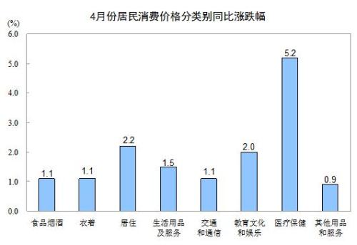 其他七大類價格同比均上漲。其中,醫療保健、居住、教育文化和娛樂價格分別上漲5.2%、2.2%和2.0%,生活用品及服務、衣著價格分別上漲1.5%和1.1%,交通和通信、其他用品和服務價格分別上漲1.1%和0.9%。