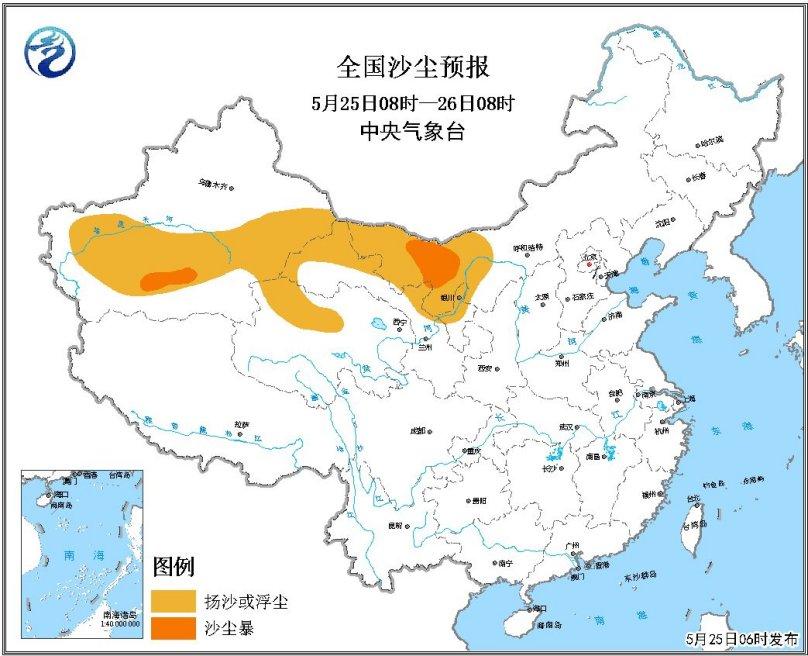 25日至26日,受大風影響,西北、華北中北部等地的部分地區自西向東將有一次沙塵天氣過程,其中25日08時至26日08時,新疆南疆盆地、青海西北部、內蒙古西部、甘肅河西、寧夏北部等地的部分地區有揚沙或浮塵天氣,其中新疆南疆盆地、內蒙古西部局地有沙塵暴。因此,中央氣象臺發布沙塵天氣預報。