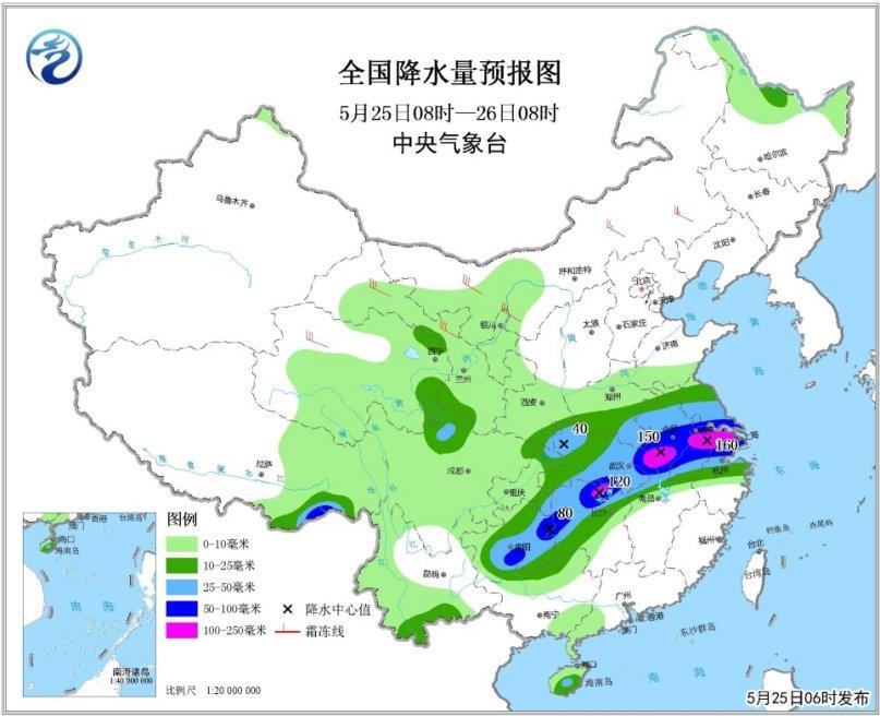 中央氣象臺5月25日06時繼續發布暴雨黃色預警:預計25日08時至26日08時,河南東南部、蘇皖中南部、上海、浙江北部、湖北中東部和西北部、湖南北部、貴州東部和南部、重慶東北部等地有大到暴雨,其中,安徽中部偏南地區、江蘇南部、湖南北部等地局地有大暴雨(100~160毫米);上述部分地區并伴有短時強降水、雷暴大風等強對流天氣,最大小時降水量40~60毫米。