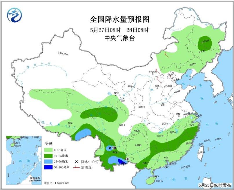 5月27日08時至28日08時,內蒙古中東部、東北大部、青藏高原大部、西南地區大部、江南、華南等地有小到中雨,其中西藏東南部、云南北部和南部的局部有大雨或暴雨,上述地區并伴有雷雨大風和短時強降水等強對流天氣。內蒙古中部、華北北部等地有4~6級風。