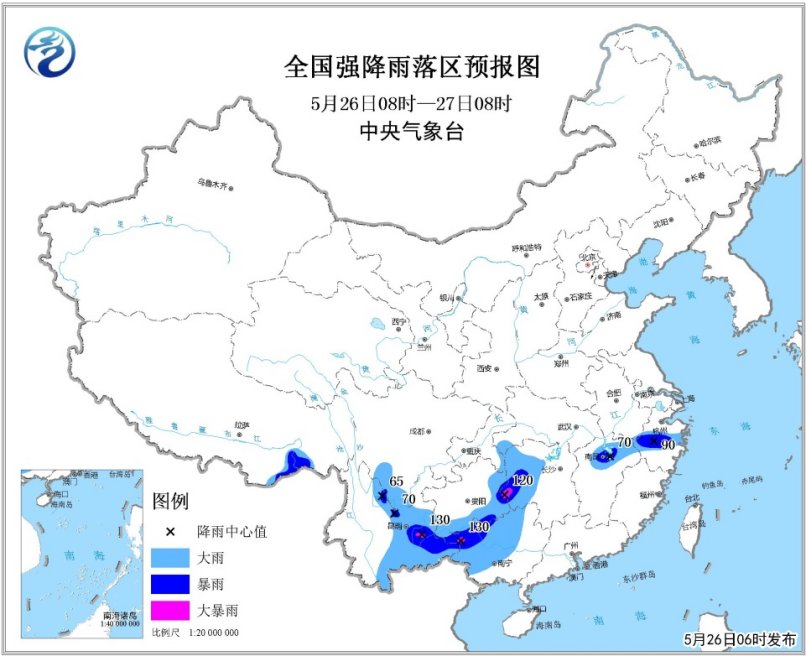 中央氣象臺預計,26日8時至27日8時,浙江中部、江西北部、湖南西部、貴州東部和南部、廣西中西部、云南東部和南部、四川南部等地的部分地區有大到暴雨,其中,湖南西南部、貴州東部、廣西西北部、云南東部局地有大暴雨(100~130毫米);上述部分地區并伴有短時強降水、雷暴大風等強對流天氣,最大小時降水量40~60毫米。中央氣象臺5月26日6時繼續發布暴雨黃色預警。