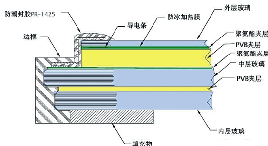 A320系列的風(fēng)擋由多層不同的材料組成,最外層的是熱鋼化玻璃,位于中層和內(nèi)層的是化學(xué)強(qiáng)化玻璃,各層玻璃之間通過(guò)聚胺酯層和PVB層粘接在一起。