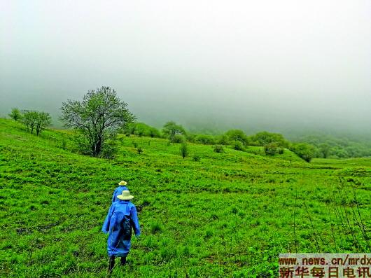 記者依依不舍地告別珙桐,又攀行一小時許,終于抵達海拔2200米左右的山頂“黃竹埡”。登高遠眺,山的另一側(cè)呈現(xiàn)出截然不同的景象:一望無際的草叢鋪就連綿起伏的綠毯,散落的樹林在雨霧中勾勒出神秘而美麗的輪廓。