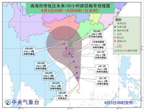 預計,低壓中心將以每小時10公里左右的速度向偏北方向移動,強度逐漸加強,將于3日白天到夜間發(fā)展為今年第4號臺風(熱帶風暴級),并逐漸向海南島東部一帶沿海靠近。