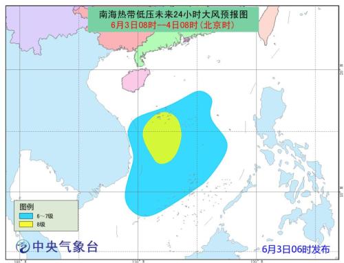 中央氣象臺3日06時繼續(xù)發(fā)布熱帶低壓預報:南海熱帶低壓的中心今天5點鐘位于我國西沙永興島偏南方大約410公里的南海南部海面上(北緯13.2度、東經(jīng)111.9度),中心附近最大風力有7級(15米/秒),中心最低氣壓為1002百帕。