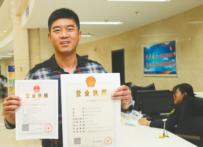 近日,山東省榮成市行政審批局正式掛牌成立,現(xiàn)場(chǎng)封存了相關(guān)部門29枚原審批專用章,“榮成市行政審批局”公章啟用。圖為榮成市市民領(lǐng)取一張加蓋“榮成市行政審批局”公章的營業(yè)執(zhí)照。王福東 攝