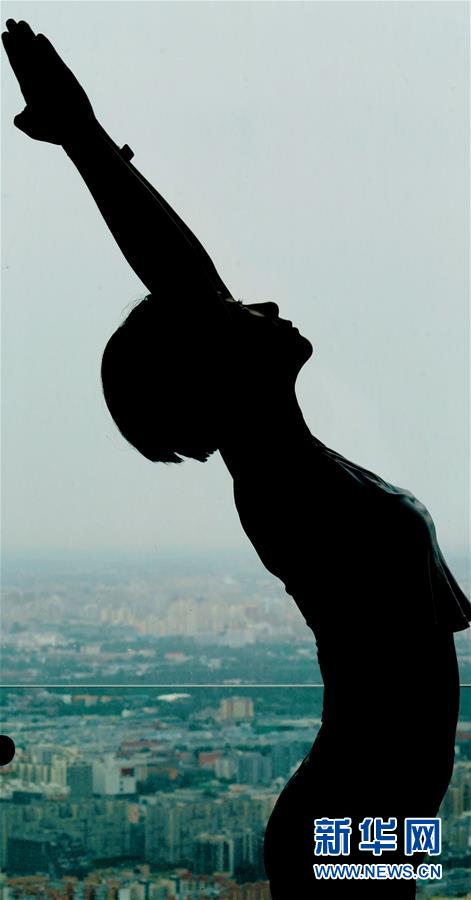 當日,數名瑜伽愛好者在專業瑜伽教練的帶領下在北京國貿大酒店70層以上的高樓層練習瑜伽,體驗高空練習瑜伽的樂趣。