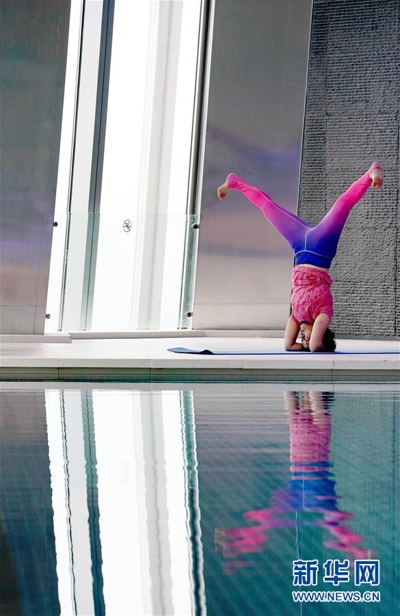 6月9日,在北京國貿大酒店78層游泳館,瑜伽愛好者練習瑜伽。