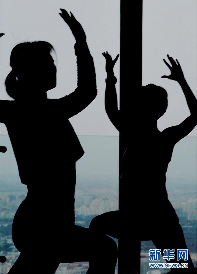 當日,數名瑜伽愛好者在專業瑜伽教練的帶領下在北京國貿大酒店70層以上的高樓層練習瑜伽,體驗高空練習瑜伽的樂趣。