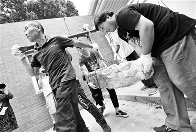 在昨天的文物搬運現(xiàn)場,兩位工人挑擔(dān)子,兩位工人用手托住龍頭兩邊,四人費了好大勁才將螭頭搬到車上,開啟“回家”之路。待螭頭到達圓明園后,將有專家對它們進行全身“體檢”,制定修復(fù)方案。“這些螭頭有一些小裂縫,如果不好好保護,時間久了容易出問題。”圓明園文物考古科科長陳輝說。(記者 李夢婷)