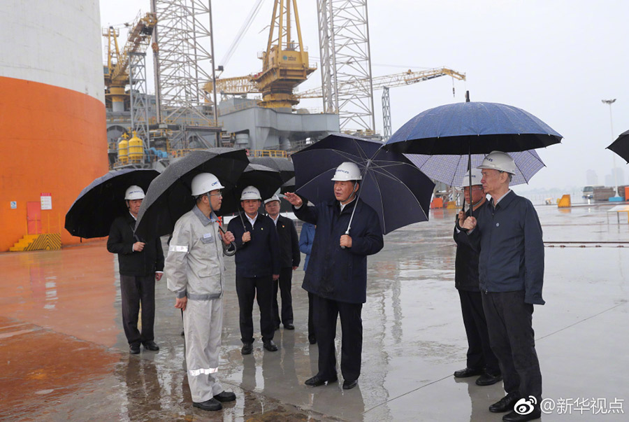 6月13日下午,習近平冒雨來到中集來福士海洋工程有限公司煙臺基地?!八{鯨1號”鉆井平臺巍峨佇立、“泰山”龍門吊高聳入云,習近平撐著傘邊走邊看,詳細了解企業走自主創新發展之路、開展高端海洋工程設備自主設計研發制造情況。聽說“藍鯨1號”去年創造了可燃冰開采時間和產量兩項世界紀錄,習近平鼓勵他們繼續努力。總書記同現場的工人們一一握手,他說,基礎的、核心的東西是討不來買不來的,要靠我們自力更生、自主創新來實現。我看你們有這個信心,希望你們迎難而上、再接再厲。(記者張曉松、謝環馳)(點擊觀看視頻)