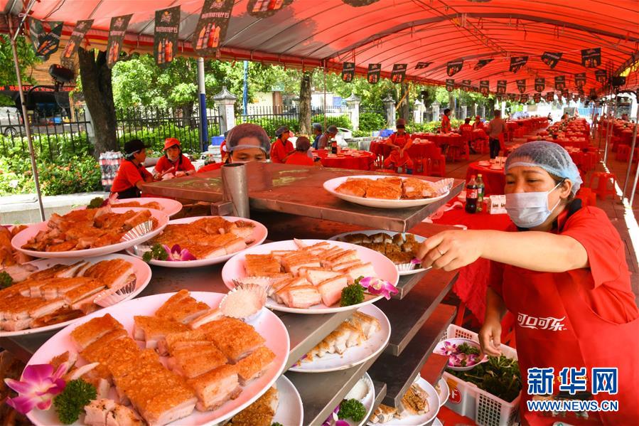 6月14日,工作人員在廣州天河區(qū)珠村七夕廣場準備龍舟飯。當日,廣州市天河區(qū)舉行一場熱鬧歡快的龍舟活動,來自多個村莊“走親戚”的龍舟隊參加。按廣州的傳統(tǒng)習俗,每年農歷五月初一至初五,各村的龍舟隊要到周圍村落“走親戚”。走親戚的龍舟隊到來時,受訪村子要準備好龍舟飯招待來客。活動當天,鳴炮敲鑼,一派喜慶氣氛。新華社記者 鄧華 攝