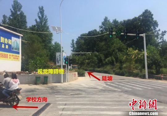 14日中午,記者趕至事發現場時發現,事故發生的路口距離學校大門不足100米,挨著學校紅綠燈的左側路口是一陡坡,而且存在一定的視覺盲區,極易發生交通事故。