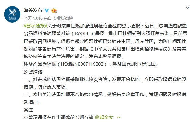 海關總署警示通報稱,近日,法國通過歐盟食品飼料快速預警系統(RASFF)通報一批出口牡蠣受到大腸桿菌污染,目前雖已采取召回措施,但仍有部分問題牡蠣已經銷往中國、丹麥等國。