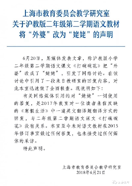 上海市教育委員會教學研究室今日發表關于滬教版二年級第二學期語文教材將“外婆”改為“姥姥”的聲明。聲明稱,網絡媒體引用的答復,是2017年研究室對一位讀者來信反映的一道英文翻譯題翻譯方式的回復,與二年級第二學期語文課文《打碗碗花》沒有關系。
