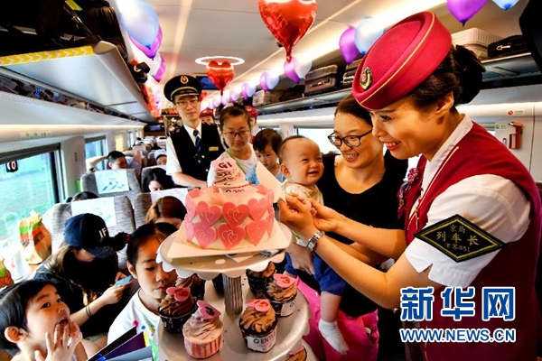 6月26日,在北京南至上海虹橋的G1次“復興號”列車上,乘務員與旅客一起切蛋糕慶祝。當日,由北京南至上海虹橋的G1次“復興號”列車上舉行“復興號”運營一周年慶?;顒??!皬团d號”是由中國鐵路總公司牽頭組織研制、具有完全自主知識產(chǎn)權、達到世界先進水平的中國標準動車組,自2017年6月26日投入運營以來,以其良好的乘車體驗廣受旅客歡迎。新華社發(fā)(楊寶森 攝)